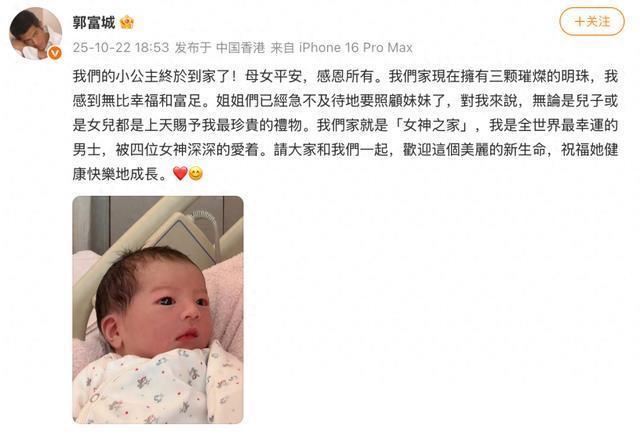 10月22日,郭富城发文官宣三胎出生: 我們的小公主終於到家了!母女平安,感恩所有。我們家現在擁有三颗璀的明珠,我感到無比幸福和富足。姐姐們已經急不及待地要照顧妹妹了,對我來說,無論是兒子或是女兒都是上天賜予我最珍貴的禮物。我們家就是「女神之家」,我是全世界最幸運的男士,被四位女神深深的愛着。請大家和我們一起,歡迎這個美麗的新生命,祝福她健康快樂地成長。